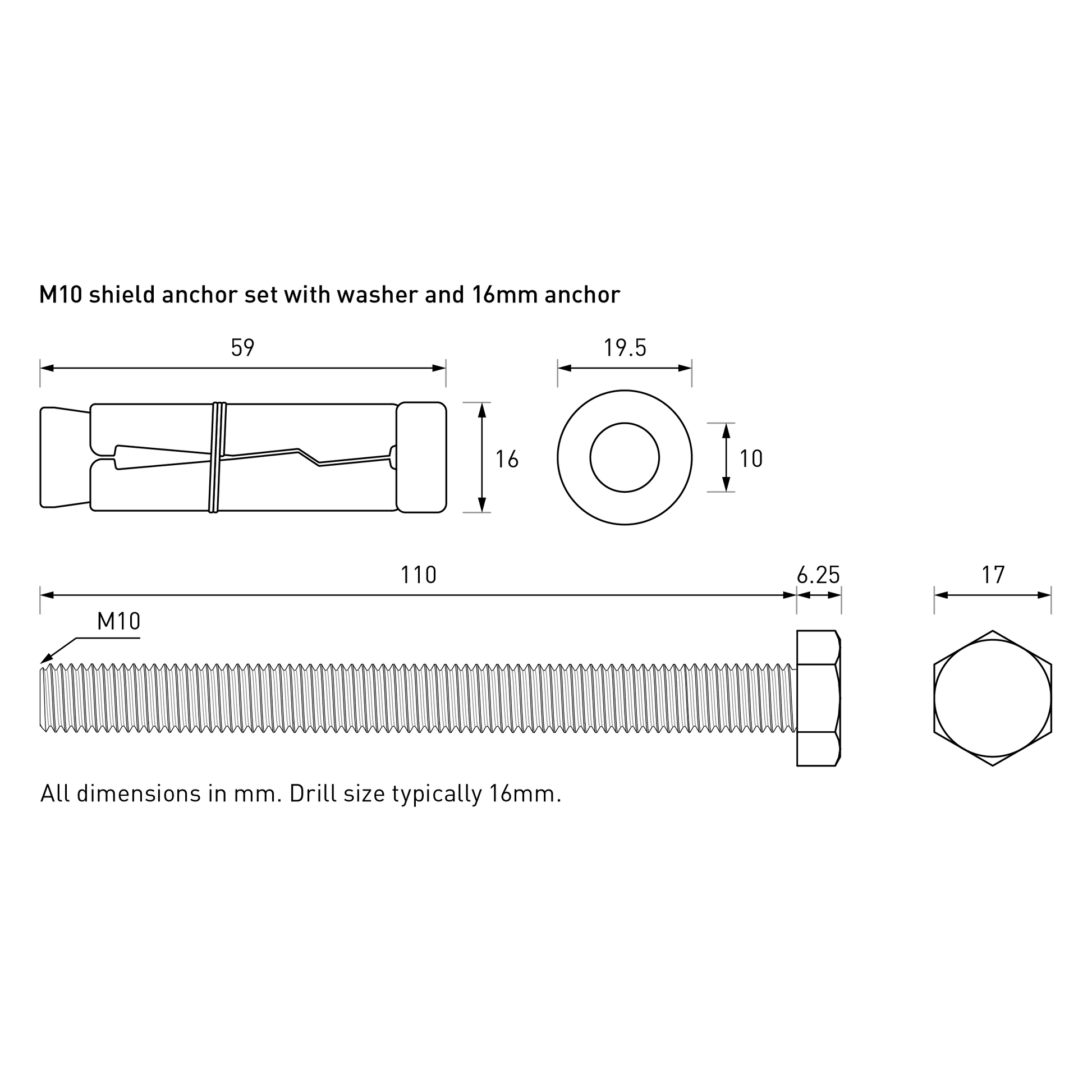 - 110mm, M10 bolt with ~60mm, 16mm diameter shield.
